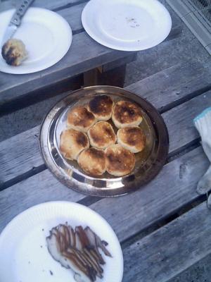 焼けたパン。手前はスモークチキンのスライス。