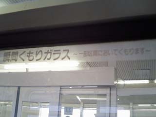 かみさんの実家近くを走るモノレールの窓です。 写真にあるように、この窓は瞬間くもりガラスという技術を使っていて、 ある区間になると 一瞬で曇ガラスになります。 その区間を過ぎるとパッと透明になります。不思議。 (05/06/12) |