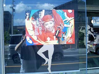 出張中、高知大学付近にて。 よさこい祭りのポスターなのですが、 貼ったウィンドウの柄がまずかった。 全体として変な図柄にみえてしまいます。 (05/08/07) |
