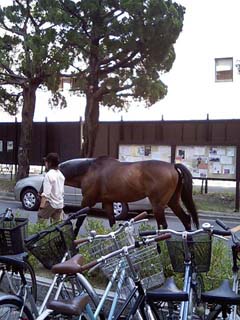京都大学にて。 普通に車道を馬が歩いてます。時々みる光景。 実は馬術部というのがあるのです。 (05/08/29) |