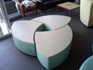 スーツ姿で、ひとりで黙々とソファーを動かして遊びました。笑 8つしかなかったのですけども、もしももっとあったら写真の並べ方で ぴたりと円形に並ぶでしょうか?もしピタリと円形に並ぶなら、 全部でいくつ必要でしょうか? (05/10/01) |