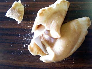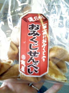 このように割ると中から紙のおみくじが出てきます。 せんべいの隙間から1個ずつ入れるには大変そうだし、 かといって、おみくじを入れてから焼いたり揚げたりしたら おみくじが焦げてしまいます。 さて、どうやって作ったのでしょうか? ゼミのメンバーの間で話した結果、「なるほど!」といえる 結論が出ました。 (05/10/19) |