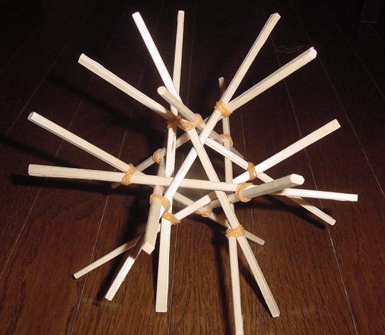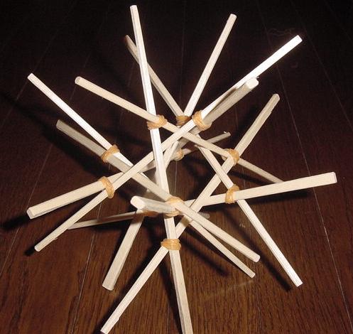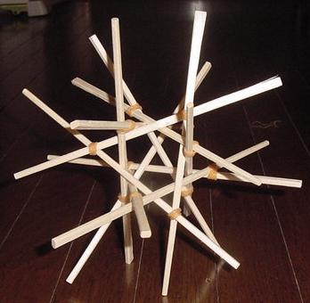 (訳者注:剛体の円柱が互いに自立する構造として 日詰明男氏の 「六勾」があるはず。http://www.cs.otago.ac.nz/gpxpriv/public_html/Geoff/NovaPlexus.htmlより