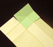 図のように 2箇所に切れ目をいれます。 右上にできた正方形の部分が鶴になります。 (図で緑色に示した部分) 切れ目は正方形の辺の半分の長さです。 |