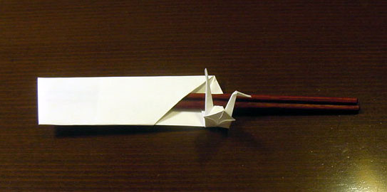 首をまげて頭をつくり、羽を広げたら、 箸袋の底になる部分を裏に折り曲げて 出来上がり。 |