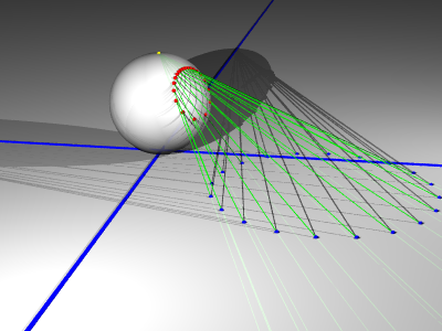 この平面に接する球面を考えます。平面と球面の接点を南極と呼ぶことにして、