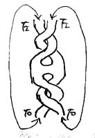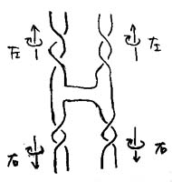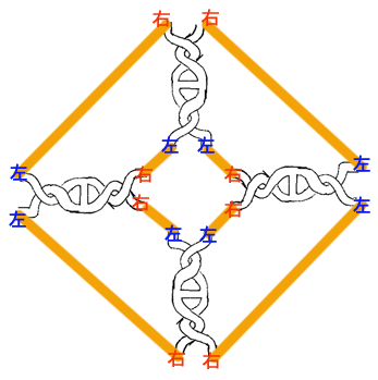 帯のねじれは上部の2本では 左ネジ回り、下部の2本では右ネジまわりに