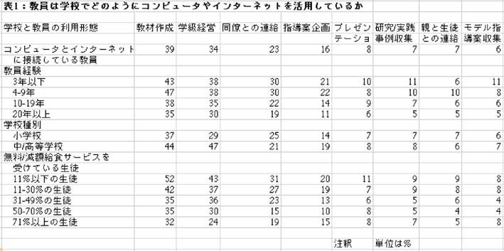 無料、あるいは減額給食サービスを受ける生徒が11%以下である学校の教員の52%は、指導教材作りのためにコンピュータやインターネットを「頻繁」に使う傾向がある。一方、無料、あるいは減額給食サービスを受ける生徒が71%以上である学校の教員の場合は、その利用率が下がり32%となっている。さらに、生徒情報などの管理のための利用についても無料、あるいは減額給食サービスを受ける生徒が11%以下である学校の教員の43%が使っているのに対して、無料、あるいは減額給食サービスを受ける生徒が71%以上である学校の教員の場合は24%というように利用率が下がる傾向がある。
