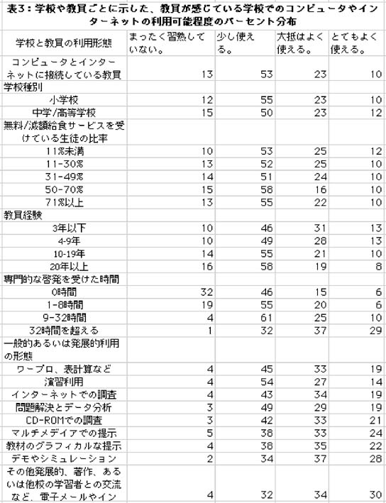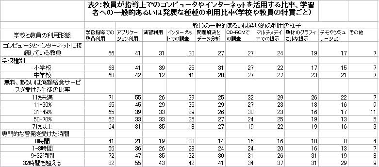 教員がコンピュータやインターネットの利用法を生徒に指導する方法であるが、指導する科目や指導する学年レベル、または減額給食サービスを受ける生徒が多いか否かによって異なっている。小学校の教員は、中学校の教員に比較して、ドリル型の実践を指示する(39%対12%)のに対し、問題解決のために生徒がコンピュータやインターネットを使用する傾向(31%対20%)である。ところが、中学校の教員は、インターネットを使った情報検索や調べ学習を指示する傾向にある(41%対25%)。減額給食サービスの水準がもっとも低い学校の教員は、逆に減額給食サービスの水準が最も高い学校の教員に比べて、「適度」または「頻繁」にコンピュータソフトやCD-ROMを用いた情報検索を指示する傾向が見られる。(表2)