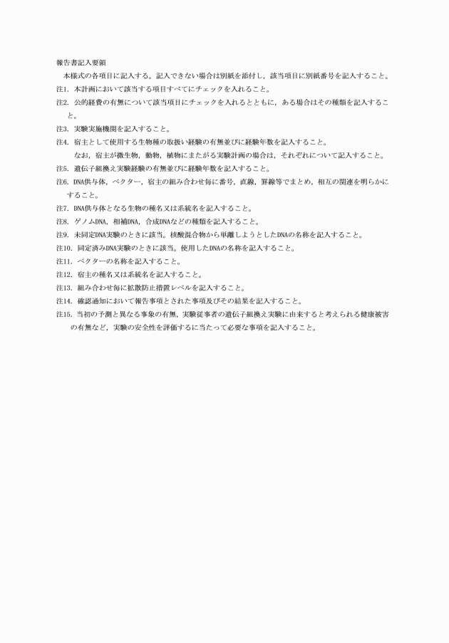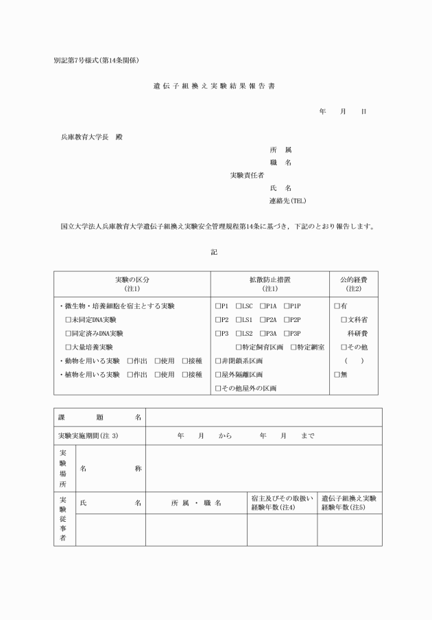 第14条 実験主任者は,実験を終了又は中止したときは,別記第7号様式による遺伝子組換え実験結果報告書を,安全主任者を通じ,学長に提出しなければならない。