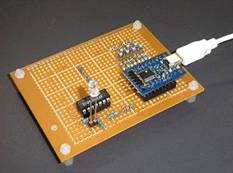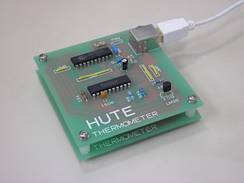 増幅やスイッチング素子として用いるトランジスタですが,それ以外にも興味深い性質を持っています.例えば,負性抵抗特性.これを利用すれば,簡単な回路でLEDを点滅させることができます.当研究室では,そのような興味深い性質を利用した,これまでにない新しい教材の開発を行っています. 4.USBインターフェース(USB-IO,USB-IO2.0)を使用した計測・制御教材の開発 写真は,発光ダイオードなどの電子部品の電流―電圧特性をコンピュータ制御で自動測定する装置です.USBインターフェースを使用しているため,パラレルポートやRS-232Cが無いコンピュータでも使用できます.0(V)〜5(V)の範囲で電圧を変化させ,電圧上昇時と下降時の両方で電流を測定します.電流が約16mAを超えると自動的に電圧下降モードになります.測定時間は10秒ほどです.USB-IOを使用しており,比較的安価で製作できます.Excel VBAのプログラムで操作し,測定結果は自動的にExcelのシートに記録されます. USB-IOを用いた電流―電圧測定器 測定結果の例 USB-IOを使ってデジタル温度計を作ってみました.温度センサの出力を8ビットのA/Dコンバータを使ってデジタル化し,USB-IOで読み込んでいます.Excel VBAで操作しているため,測定した温度をExcelのシートに記録できます.