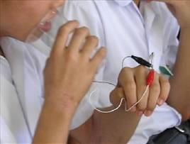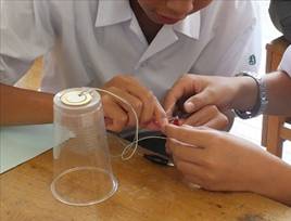 下の写真は赤(R),緑(G),青(B)の3原色のLEDをUSB-IO2.0で制御し,加法混色の実験ができるようにしたシステムです。円筒形の部分の中にLEDが各色5個ずつ入っており,室内照明下でも確認できる明るさで混色を確認できます(写真左)。ふたを取って中を見ることもできますので,実際に3つの色だけでさまざまな色を作っていることが確認できます。またこのシステムでは,同じLEDを使って,色紙などの色を測定することができます(写真右)。それぞれの色紙の色を表現するために,赤,緑,青の光をどの割合で混ぜればよいか,実験により確認することができます。 5.エネルギー変換教材の開発 音や声などの振動エネルギーを利用した発電を体験できる教材の開発も行っています.プラスチックのコップの底に圧電素子を取り付け,声のエネルギーでLEDが光るようにしたものを作り,中学校で実践を行いました.詳しくは論文「振動発電教材の高効率化のための回路の検討と授業実践」をご覧ください.