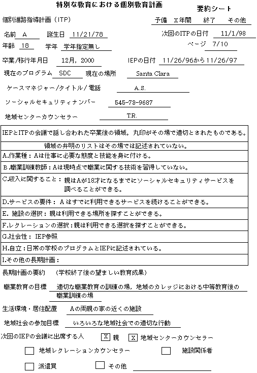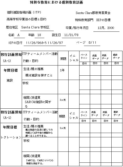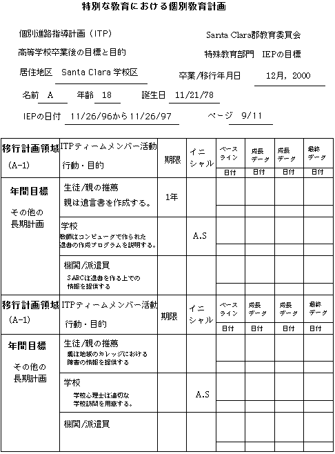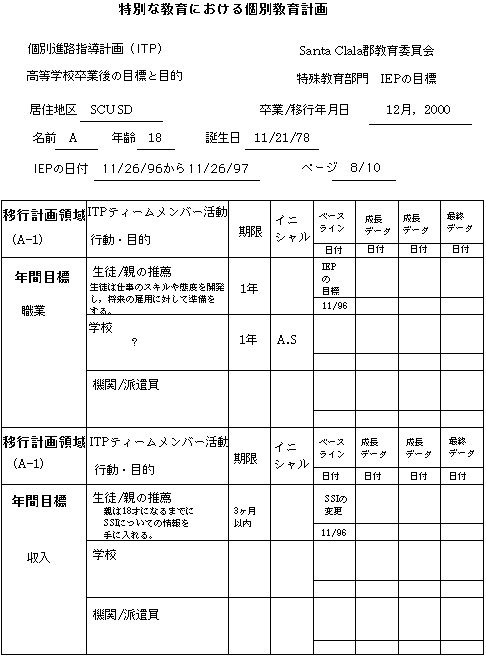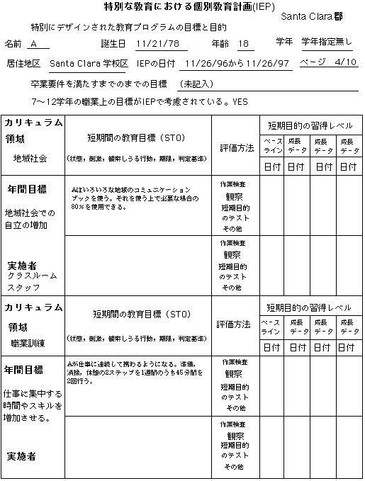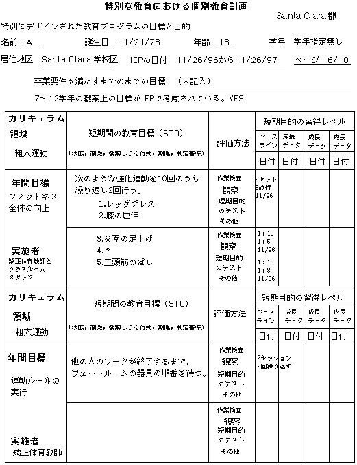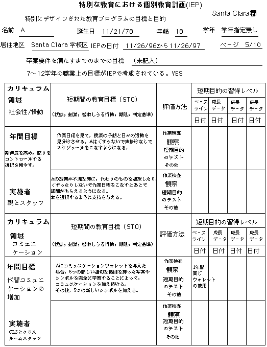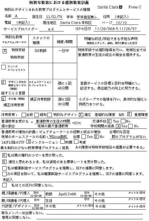 Aは現在Santa Clara高校でノンカテゴリカルプログラムを受けていて,1週間に1回の割合で言語療法士と矯正体育スペシャリストから計画的な指導サービスを受けています。Santa Clara高校へ進学する前は,Busher中学校でノンカテゴリカルプログラムを受けていました。Aは,発達遅滞,てんかん性異常波,性染色体異常という診断を受けています。彼女の健康は良好で,学習活動における「聞え」と「見え」は良好と思われます。彼女は,母親とSanta Clara市内に住んでいます。