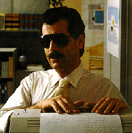 1 障害者が必要とする周辺機器の強化 現在のMacintoshは付加的機能といった拡張性を有しているため、その利用をいっそう高める可能性 をもっています。この付加的機能とは、フルカラーボードであり、通信機能であり、入力装置としての マウスであり、内蔵されたデスクトップ管理やアイコンなどのことです。一言でいえばインターフェイ スというユーザー本位の拡張機能ということになります。具体的には、こうした機能のいくつかは障害 のあるユーザーにとってきわめて有用なものとなっています。例えば、音声合成・認識装置、拡大画面 ソフト、画面読み上げ、キー操作制御などです。障害のあるユーザーは、このような付加的機能を使っ て情報資料にアクセスができるようになります。こうした機能によって、かつては障害のゆえに人の助 けを借りなければできなかった作業が自力でできるようになってきています。 インターフェイスを選択する過程で重要なことは次のようなことです。すなわち、いろいろなテクノ ロジ、例えば音声合成・認識などを使うコンピュータの活用を進める際の経験は、将来、機器応用のた めのアセスメントを行う上で、すべてのユーザーにとって潜在的な恩恵をもたらす契機となることです。 音声出力を例にとると、この技術は主として視覚障害者に使われることが多いと考えられますが、今後 は健常者にもいっそう使われるようになると思われます。情報が電子化されますと、障害者に限らず、 多くの人が自宅や遠く離れた所で仕事をしていても、コンピュータを使ってメールなどを通して作業が できます。 2 障害者と生産的な生活の増大 仕事とインターフェイスの例 その1:文書作成と音声の活用 文書の編集という卑近な例からこの過程を考えてみましょう。まず関連する情報の検索から始め、最後 はレイアウトを行って文書の作成を終えるとします。こうした編集をするために必要な一連の操作を行 なうことは、本来、誰にでも要求され経験することです。例えば、盲の人々が文書を検索しようとする 際の基本的な制約としては、コンピュータ上で文書作成の作業をするとき画面上の文書が見えないとい うことでです。このとき、テキスト情報などの視覚提示に代わって音声出力や点字出力ができれば、こ うした制約から解放されるのです。音声出力がコンピュータに付加されているならば、視覚が不自由で あるか否かに拘わらず多くの人が音声出力の恩恵を受けれるわけです。音声はかえって耳障りになるこ ともあるでしょう。そのときは音声を切っておけばよいのです。 その2:仕事と電子化 いろいろなテクノロジ、例えば音声合成・認識などを駆使したコンピュータ利用の経験もすべてのユー ザーにとって潜在的な恩恵をもたらす契機となります。ユーザーは遠く離れた所で勤務していても、コ ンピュータを使って電子化された職場からメールなどを通して仕事ができます。いわゆるテレワークで す。さらに、新聞や雑誌などの印刷文字(墨字)情報の検索や入手をしたいときなども音声合成・認識 を利用できるでしょう。もっともこのシステムは時間との勝負である用件や、近くにアクセスポイント などがない場合には向かないかもしれません。 その3:仕事と”賢い”システム 情報通信のさまざまな方法がもたらす恩恵はいろいろ考えられます。特に、”手作業”や“目作業”で 忙しい人達が仕事をよりしやすくできるならそれにこしたことはありません。大多数のユーザーはキー ボードやモニタ上だけで仕事や学習を行うシステムを利用しているという点で一つの制約を受けている といえます。しかし、賢い機能を持つコンピュータを使って学習する者は、そのシステムに組込まれた 音声合成で問題の箇所を聞きながら両手を動かすことができます。ユーザーはコンピュータへ音声で応 答しながらコンピュータからの音声に耳を傾け、どの部分を修正したり繰り返して学んだらよいかがわ かるのです。もっともこうした環境によっては、”ワーコホリック”(働き過ぎ)を助長するかもしれ ませんが。 3 視覚障害 全盲や弱視の人々は、視覚障害者と呼ばれます。触覚を利用した情報処理の主たるメデイアは点字で す。これによって文章を書いたり、読んだり、伝達することができます。今までは点字の知っている人 が点字タイプライターで文書を作成していましたが、最近ずぶの素人でもカナ文字やアルファベットで 入力し、それをたちどころに点字に置き換えることができるようになりました。もちろん、その逆もで きます。図形などは立体コピー機やサーモフォームを使って凸版化したものを触って認知できます。 通常、あまり不自由なく文字などを読める人のことを俗に晴眼者といいます。この呼称は響きとして あまりよいとはいえませんが、晴眼者の中で流布する一つの共通した誤解は、盲人には点字が最も有効 なコミュニケーションの手段であるという