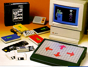 8. スキャンニング ハイパーカードを使うとき、ページめくりやボタンの位置を走査してくます。ボタンを同定し、そこに 書かれたスクリプトを実行するためにマウスを押せればよい。ボタンの走査速度は、ボタンを押せる能 力に応じて1秒から4秒の間隔に設定できます。GateWayというスタックがそれです。 (図6 挿入) 9. その他の代替入力装置 マウスはもとより、ジョイスティックやトラックボールなど価格によっていろいろ選択できます。最近 は、ペン入力のタブレットが注目されています。図形を書いたりするのはもちろん、文字認識技術の向 上によってテキストの入力も正確になっています。 (図6 挿入) 10. 大量貯蔵装置 もちろん入力の装置ではありませんが、フロッピディスクの取り扱いに関連した困難を最小にするもの として障害者のコンピュータ利用には無くてはならない装置です。光磁気ディスクも近年盛んに使われ ています。これらの貯蔵媒体は、動作性に障害のある人々が苦労するフロッピディスクの整理や挿入作 業を解消してくれます。