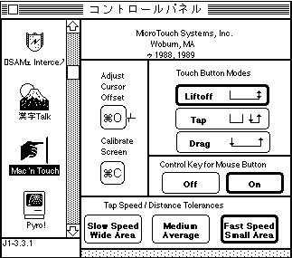 b. キーのオートリピート機能を停止もしくは調節する機能 この機能は、キーリピートエリミネータとも呼ばれます。今書いているこの原稿もリピート機能を停止 させて使っています。同じ文字の連続打鍵や連続削除には少々不便ですが、ついキーを誤って押し続け ることによる不要な入力がなくなります。Control Panelの中のKeyboardというユーティリテイにその 機能があります。 c. マクロ機能 いくつかの組み合わせキー入力を保存してマクロ機能とし、単一のキー入力によって操作を簡素化でき ます。片手打ちをする人にはこうしたキー入力の単純化は歓迎です。ソフトとしてはQuickKeyがあり、 逐次入力方式によるキーストロークの簡便化ができます。注意すべき点として、コマンドキーとの組み 合わせで行なうグローバルなキーストロークは避けることです。 d. マウス代替 マウスの使用ができない場合のために、キーボード上でのマウス機能と同等なものを具備するものです。 例えば、EasyAccessなどのユーティリティです。このソフトはSticky keyとも呼ばれ、テンキーを使っ てのカーソル移動やクリックなどを行います。ただ、使い慣れるのに少々訓練を要します。 2. キーガード類 キーの位置に指が一本入る穴を持つ滑らかな表面のテンプレートです。キーガードは標準のキーボード の上に置かれ、ユーザーの手の動きを安定化し、無用な多重キーストロークを防ぐとともに、文字入力 の正確さを保つことができます。 3. スティック類 これは手でキーボードを使用できない人のためのものです。LipStick、HeadStickなどが利用できます。 4. 超音波/光 HeadMasterは超音波と頭の動きでカーソルを操作し、呼気流でクリック、ダブルクリックを行ない入力 します。FreeWheelは光キーボードともいうべきもので、光線でキーを一定時間照射すると入力されま す。 5. 各種スイッチ、センサー 上肢の微細運動が困難な場合、わずかな動作でOn-Offや少ない選択肢から必要なものを選ぶのに適して います。 6. 音声認識 これはキーボードを使う代わりに、ウインドメニュやカーソルの制御などを音声で指示を行うためのも のです。日本語化されたVoiceNavigatorが注目されています。ファインダの操作やハイパーカードの実 行などに威力を発揮します。今後、いろいろな使途が広がる魅力ある領域です。 (図5 挿入) 7. コンセプトキーボード/タッチパネル モニター上の作業で選択肢が少ないもの、あるいは具体物を選ぶときに便利な入力装置です。タッチパ ネルは、教育現場で子供がコンピュータ上で学習するのに適しており、MacinTouchは利用範囲が大きい といえます。